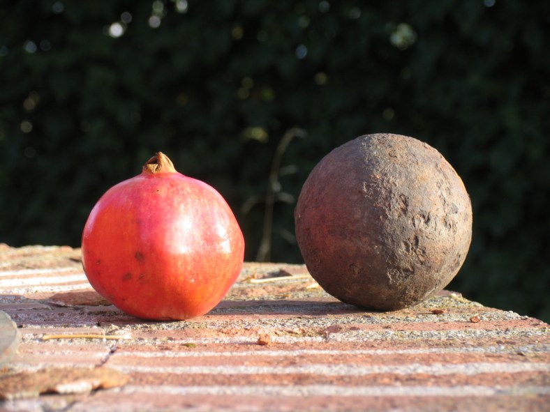 Granadas las dos. Llenas. De vida y de muerte. De paz y de guerra. De zumo dulce y transparente y de opaca y amarga metralla… La recién cogida del árbol y la disparada hace doscientos años. El milagro de la naturaleza,  pese a los ataques de eso que llaman progreso, y la destrucción insaciable de eso que llaman humanidad. Los árboles y los cañones. Los hortelanos y los soldados…El desfile de conmemoraciones por las guerras pasadas y la inanición ante las crudas, reales y actuales…