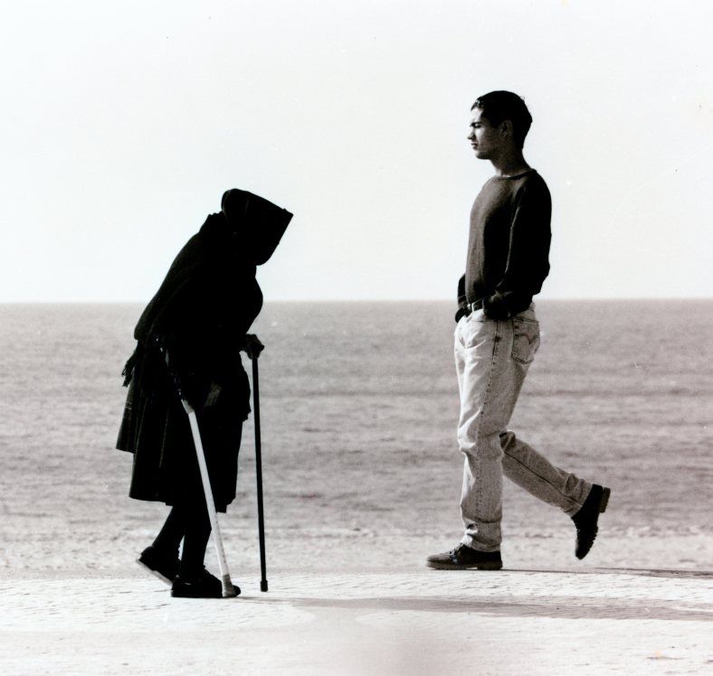 A la mujer, una silueta negra curvada por los años y el trabajo,  no se le ve la cara. Camina de espaldas al sol,  y a su lento andar le ayudan  un bastón y una muleta. El joven, las manos en los bolsillos, los ojos medio cerrados por la claridad, camina erguido, con paso firme. Decidido. El mundo por delante… Los dos en el mismo escenario. Cara a cara. Tan cerca y tan lejos… La vejez y la juventud. Puede que la enfermedad y la salud… Lo negro y lo blanco. El anverso y el reverso de la misma moneda. Con el mismo decorado de fondo. El mismo cielo y el mismo mar… Para qué más.